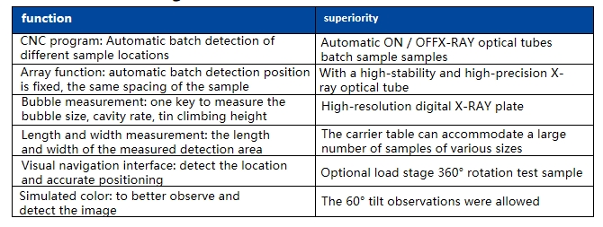 X-7900 electronic semiconductor test equipment can be used to detect integrated circuit chip semiconductor, such as BGA, IGBT, inverted chip and PCBA component welding, LED, photovoltaic and other high precision testing; widely used in industrial manufacturing field, such as automobile parts, casting testing, welding quality testing of pressure vessel and pipe and analysis of new materials; can detect defects of various types of battery, such as power battery, cylinder, flexible packaging, square shell and laminate.